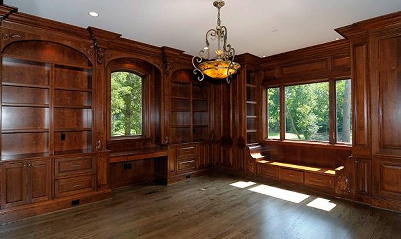 Рабочий кабинет находится на первом этаже. Стены комнаты облицованы деревянными панелями. Вдоль стен располагаются большие книжные шкафы с многочисленными полками.