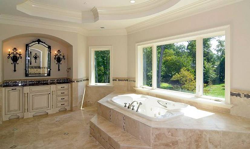 Отделка одной из ванных комнат выполнена светлым мрамором. Джакузи находится около окна на подиуме, благодаря чему можно наслаждаться водными процедурами и любоваться природой.