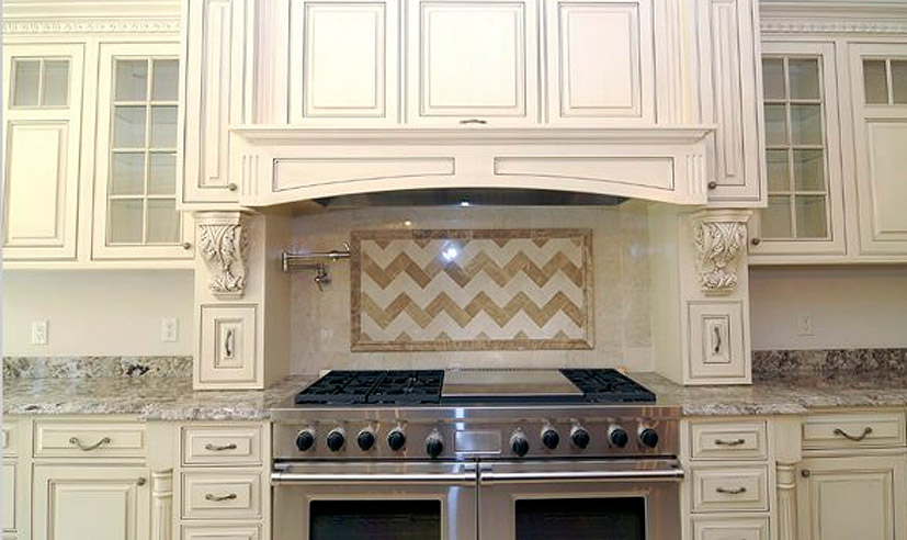 В зоне, где располагаются электрические плиты, фартук имеет оригинальный геометрический узор.