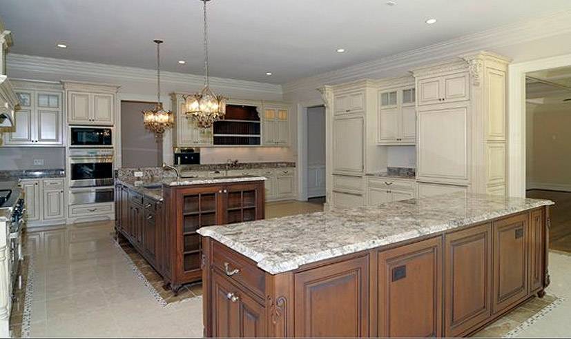 Столешница кухонного гарнитура выполнена из натурального камня. Фартук защищен экраном из закаленного стекла и оснащен подсветкой. Комнату освещают 3 больших люстры. В качестве дополнительного освещения выступают светильники.
