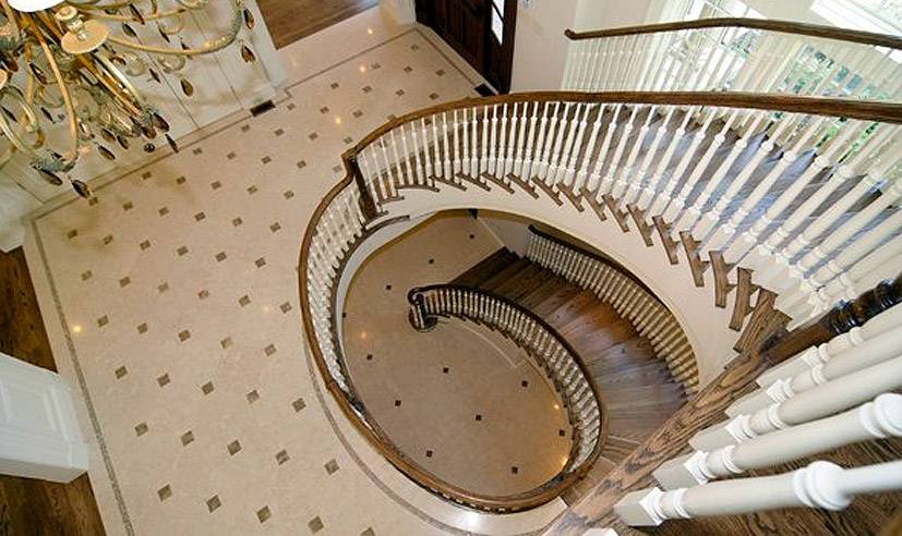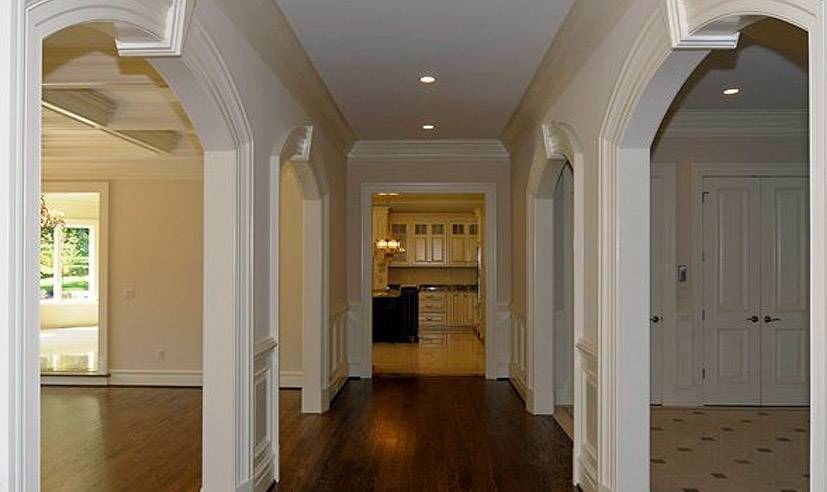 Стены холла имеют приятный персиковый оттенок, прекрасно сочетающийся с белыми колоннами и паркетом. В холле, как и в гостиной, имеется камин. Портал камина облицован натуральным камнем. В холле нет люстры. Вместо нее были установлены точечные светильники.