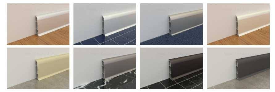 - Алюминиевый плинтус для пола, облицованный пленкой из поливинилхлорида, имеющий разнообразную цветовую гамму и текстуру.