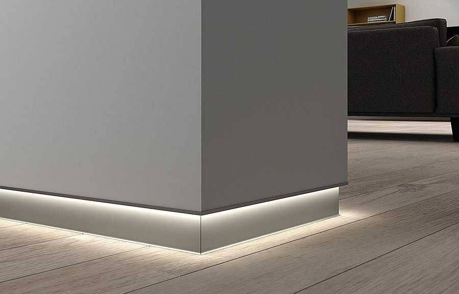 Также, алюминиевый плинтус выпускают в вариантах, которые имеют кабель-канал, подсветку, борозду под светодиодную ленту. В отдельную категорию выносят алюминиевый плинтус для кухни, которым закрывают пространство между стеной и столешкой.