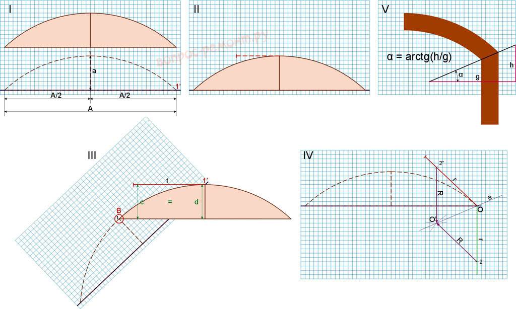 - Берем лист бумаги в клетку А4 (лучше А3), вырезаем из картона шаблон дуги арки в уменьшенном масштабе. Очерчиваем шаблон на бумаге, пока убираем. На контуре шаблона строим стрелу арки a (поз. I); касательная к ней в вершине 1 будет горизонтальна, поз. II.