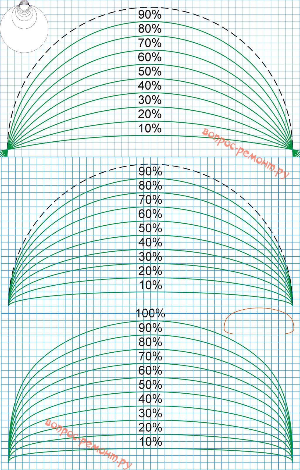 Контур полуциркульной арки размечают при раскрое материала, как известно, самодельным циркулем из рейки или куска профиля с ввинченными по краям саморезами. Но при разметке сегментной арки радиус образующей окружности стремительно нарастает с уменьшением ее стрелы, что особенно актуально при низких потолках. Если кто-то и сделает реечный циркуль с плечом в 5, а то и 15 м, то как им пользоваться? Равно как и строить по формулам дугу эллипса или сложной кривой персидской (модерновой) арки. На такой случай на рис. даны чертежи семейств образующих кривых сегментных (вверху), эллипсных (в середине) и персидских (внизу), по которым может быть построена декоративная арка различной глубины, т.е. относительной величины стрелы: за ее 100% принято отношение пролета к стреле, равное 2, как у полуциркульной арки. При аккуратном переносе по клеточкам строительная точность в 3 мм на 1 м длины соблюдается до пролета в 3-4 м.