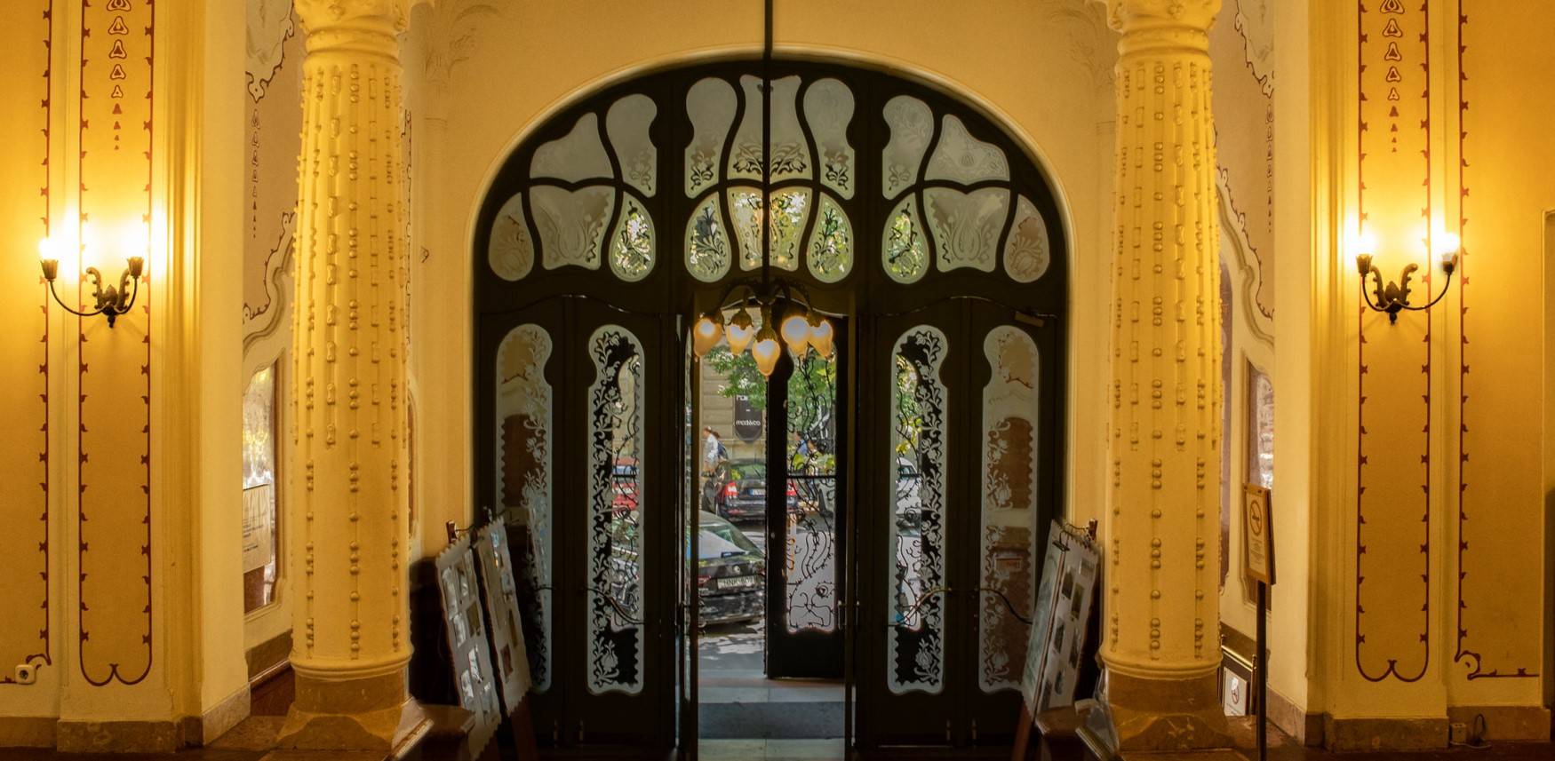 Портал Прямоугольная арка с различными элементами декора: витражные стекла, деревянная резьба.
