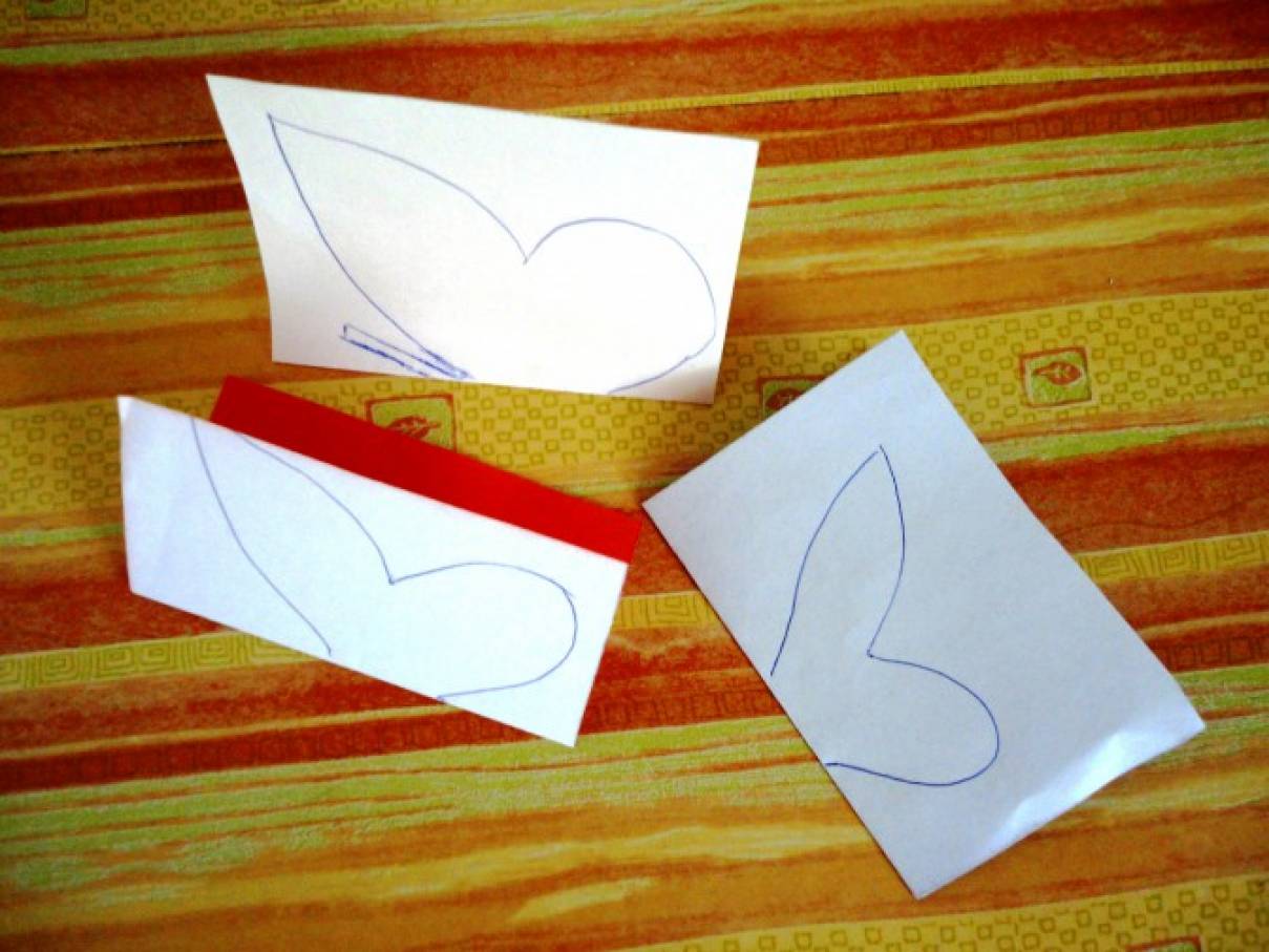 2. Складываем шаблон пополам и обводим на белый лист бумаги. Нам для бабочки надо приготовить три шаблона разного размера. Пунктирными линиями делаем контур меньшего шаблона, отступив от края 0,5 см.