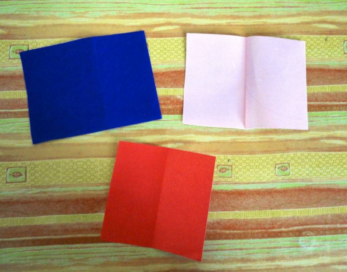1. Для того, чтобы сделать один бутон, нам понадобится три листа цветной бумаги. Берем первый и делаем из него квадрат.