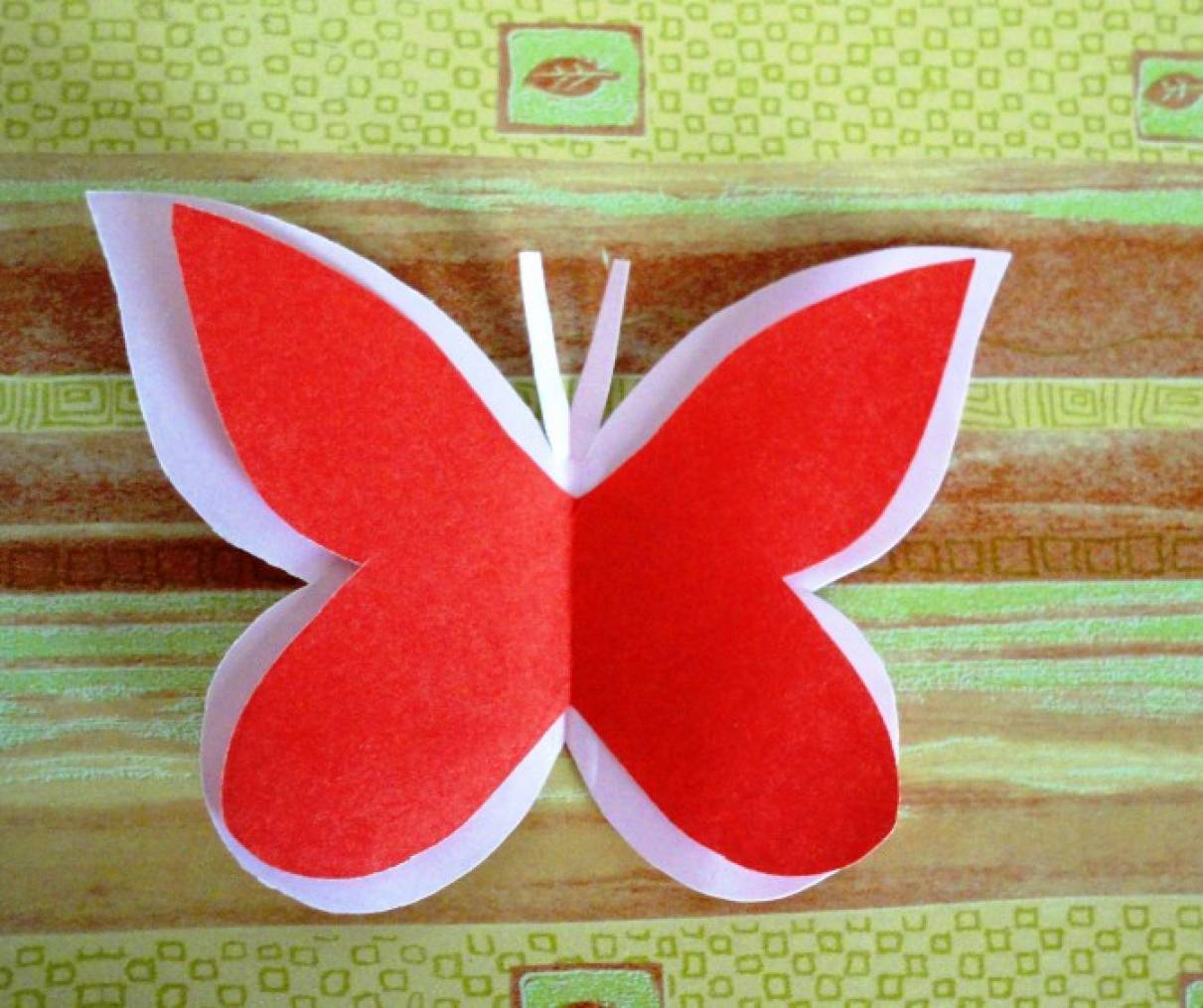 - Нарисуйте и вырежьте тело бабочки и усики. Приклейте это все посередине.