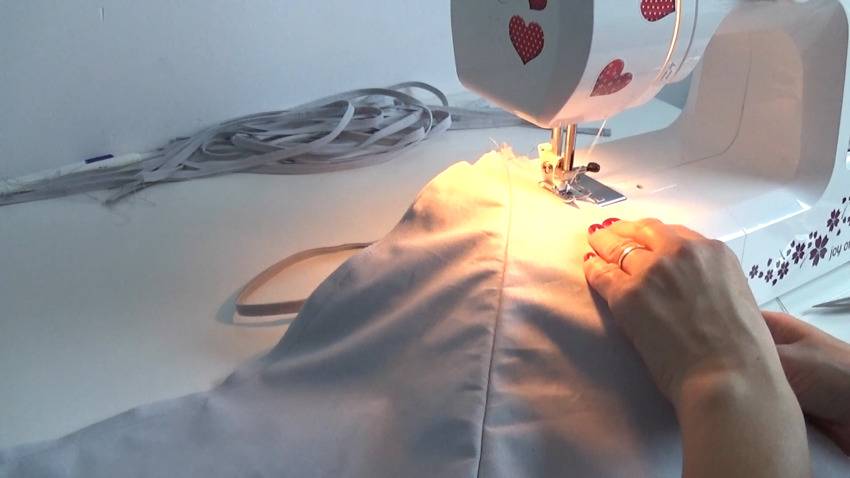 | 2 | ![]() | Получившуюся деталь выверните, сложите пополам по шву и снова прострочите. Для удобства можете прогладить утюгом эту область. Подобным образом сшейте другую часть низа балдахина. |
