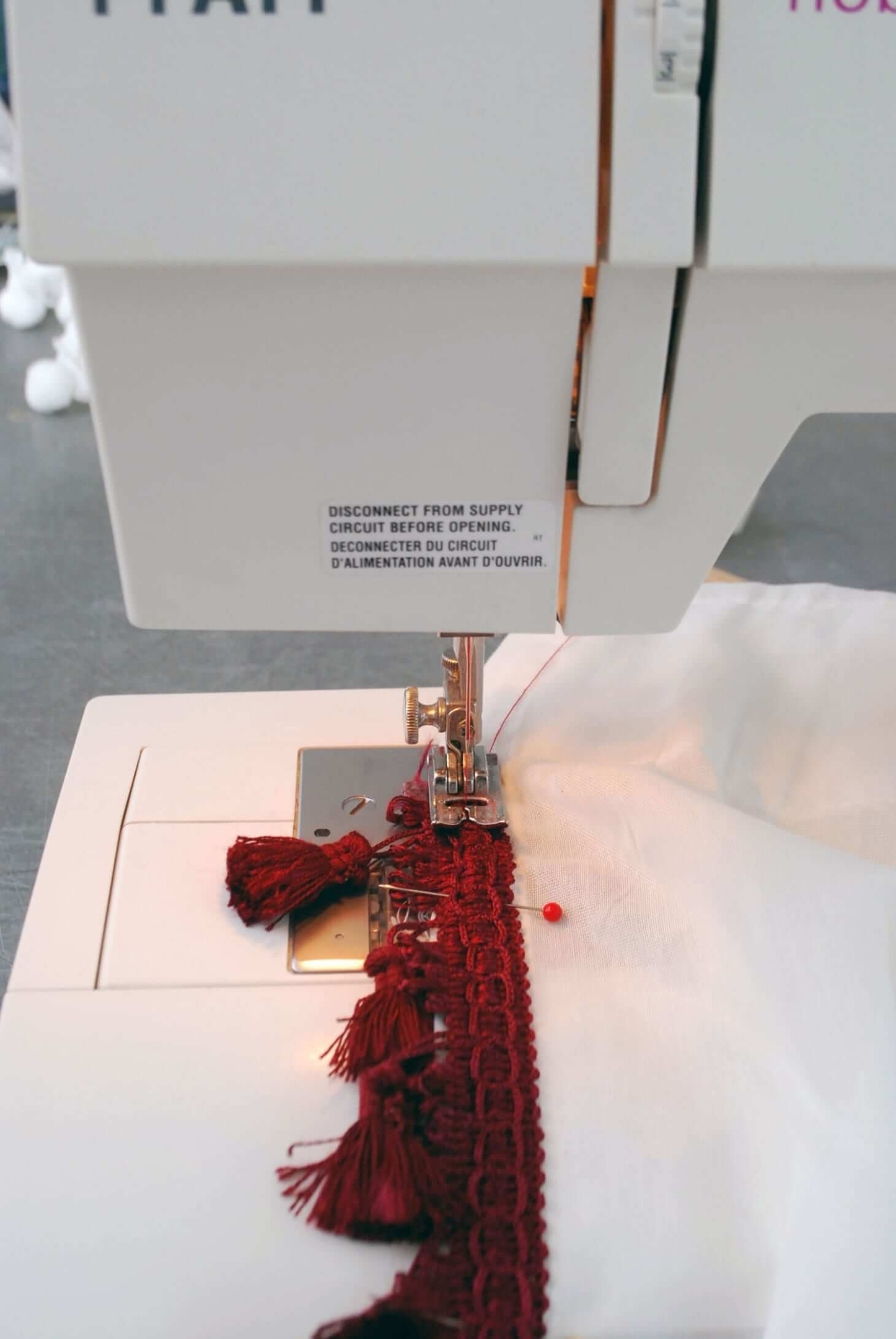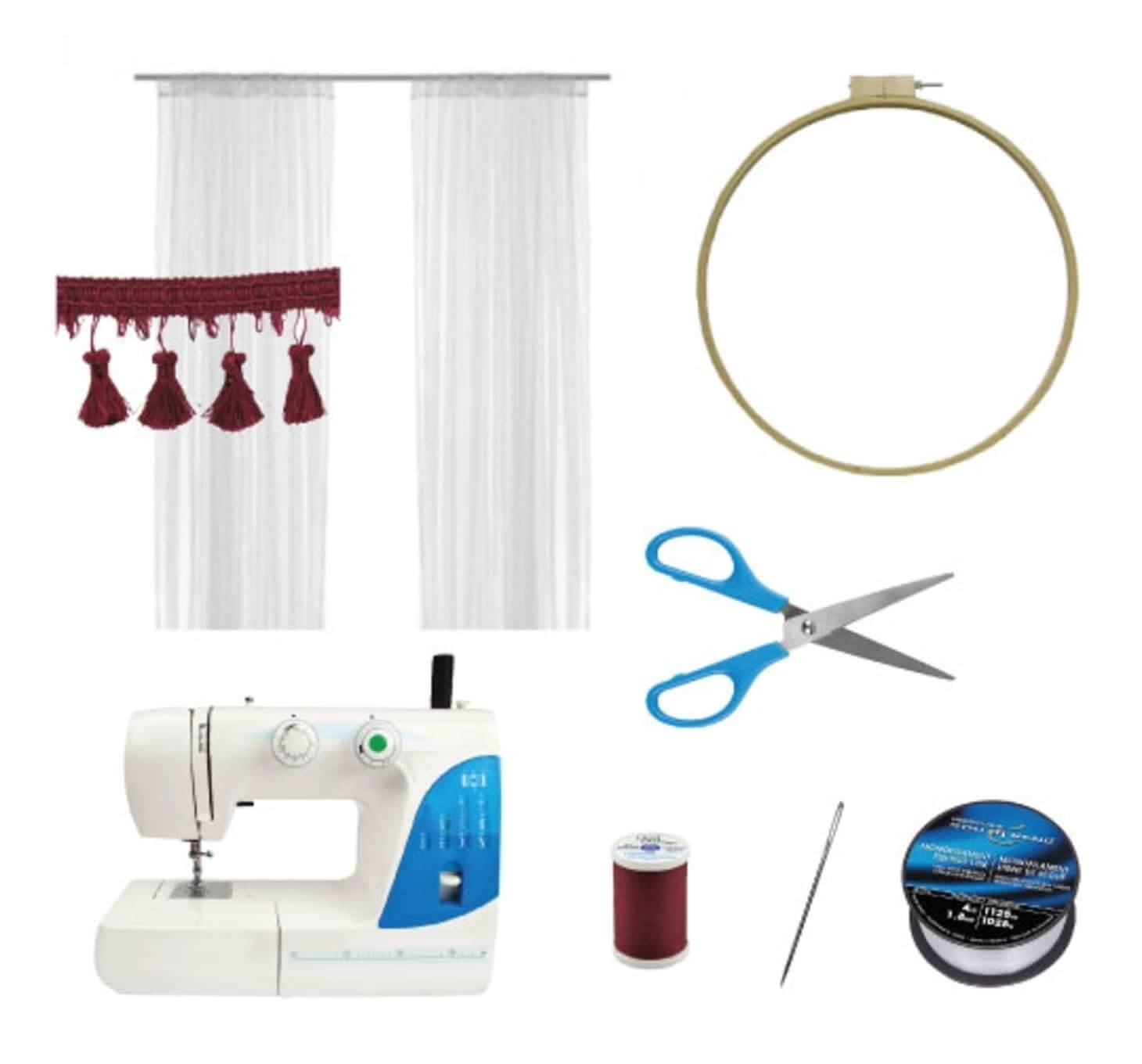 - Ткань вырежьте под каждую сторону изделия, обработайте края. Сверху пришейте драпировочную ленту, к которой закрепятся крючки.