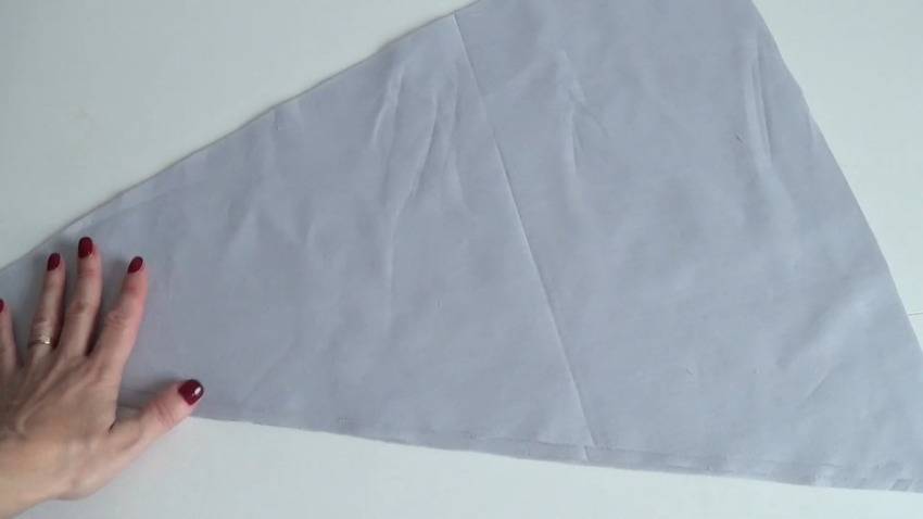 | 10 | ![]() | Выверните получившуюся деталь, сложите пополам, прогладьте шов и снова прострочите эту область. Подобным образом сшейте 2 других тканевых треугольника. |