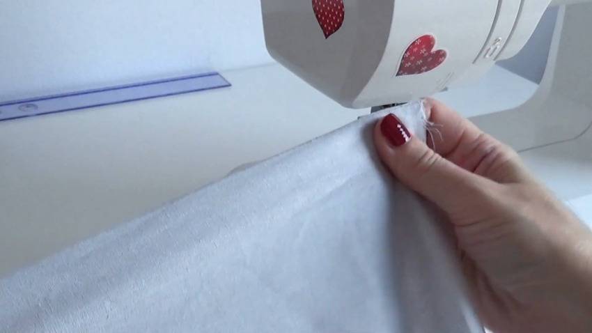 | 4 | ![]() | На верхней части сделайте отступ 1 см и прострочите, не подгибая ткань и оставив немного нити. |