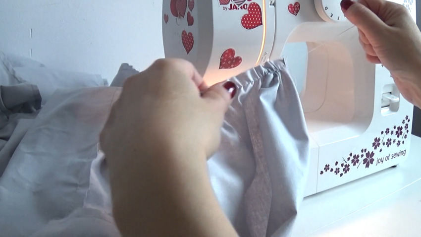 Затем пришейте ткань навеса к юбочке: для этого отогните верхний край на 12 см и прострочите вместе с балдахином. При этом нужно аккуратно распределить складки.