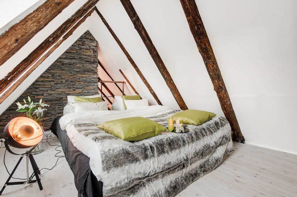 узкие балки на потолке в интерьере спальни в стиле лофт
