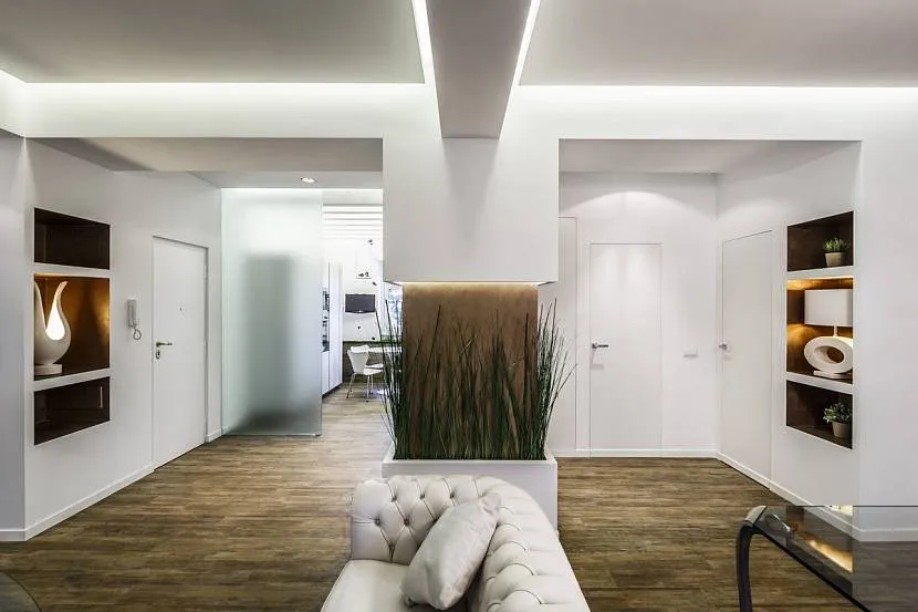 Это не просто эффектное украшение, внутри можно спрятать трубы, вентиляцию, провода или установить точечные светильники. Фальшбалки из ГКЛ часто используются для зонирования, например, чтобы отделить кухню от гостиной.