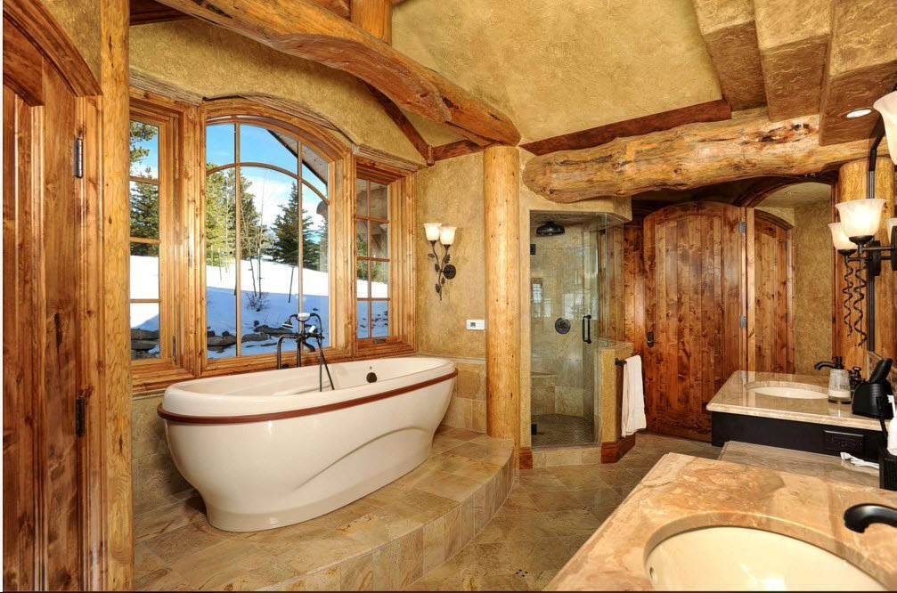 Так или иначе, но приведенные фото демонстрируют, что ванные комнаты в загородных коттеджах – хороший плацдарм для претворения в жизнь самых интересных оформительских идей. Однако балки на потолок из дерева можно и даже нужно в них использовать, только если в помещении созданы условия для полноценной вентиляции.