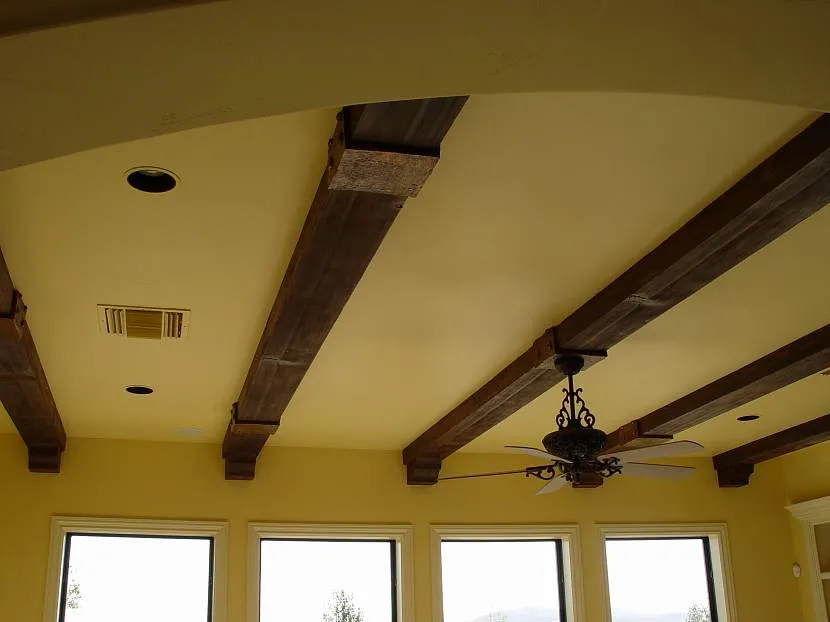 Это благородный и традиционный материал. Деревянные балки часто делают из дуба, ольхи, сосны, лиственницы или вишни. Применяются и дорогие экзотические породы, такие как дерево меранти со светло-розовым оттенком. Они могут быть не только цельными, но и полыми. В последнем случае речь идет о фальш балках. Для отделки используется тонировка, травление, втирание и напыление. Монтаж к поверхности потолка осуществляется при помощи дюбелей или саморезов. А элементы небольшой толщины допустимо закреплять при помощи клеевого состава.