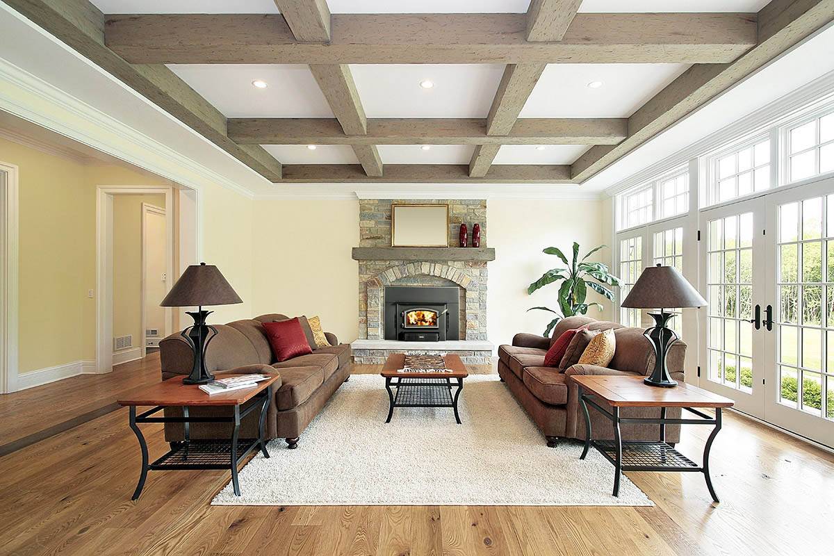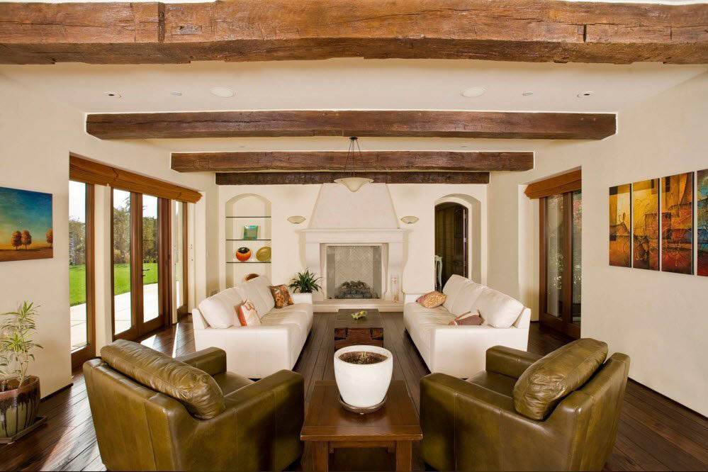 Обращайте внимание на мебель в ваших гостиных: использование декоративных балок в аналогичный тон позволит создать гармоничный цветовой баланс в помещении