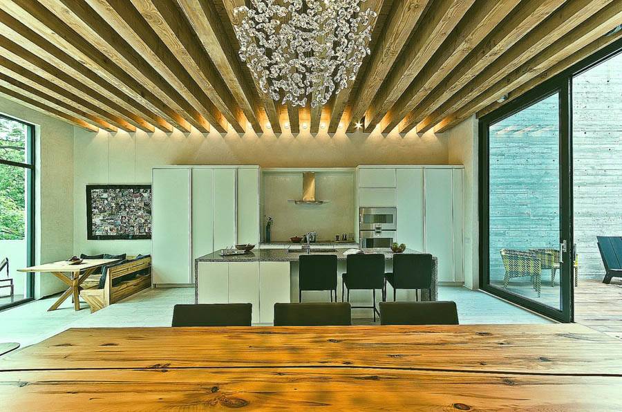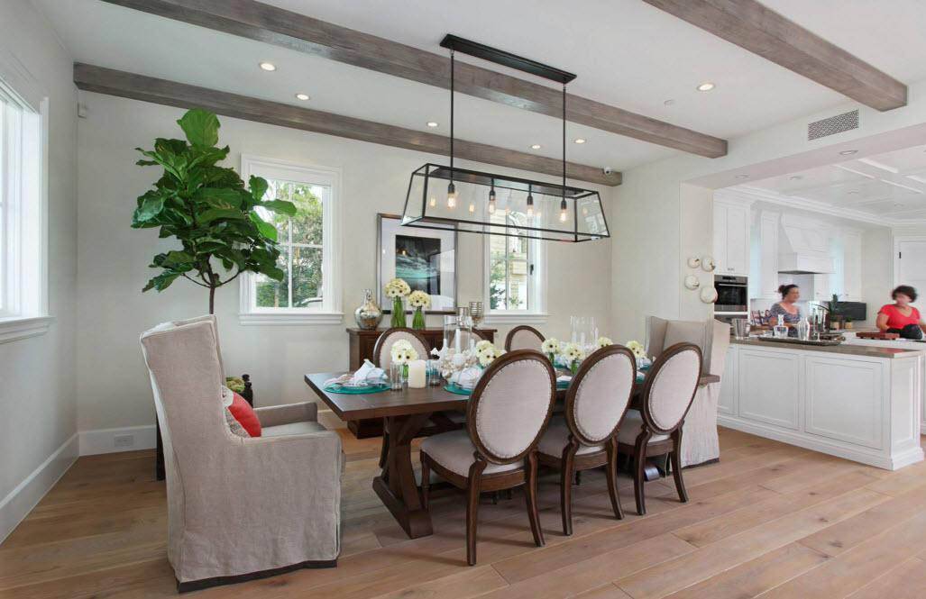 - Кухня и столовая – помещения, в которых можно реализовать любой проект, используя балки из любого материала. Часто в больших кухнях ими визуально отделяют зону приготовления еды от места, где едят.