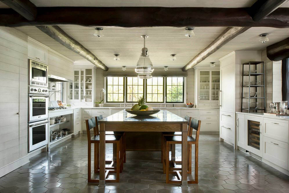 Если ваша кухня изобилует белоснежным тоном, то избавиться от ощущения стерильности, некоторой “больничности” можно как раз при помощи декоративных балок на потолке из классического дерева хвойных пород. Единственный совет: не используйте вместе с белым потолком и стенами выбеленные породы – рискуете получить не жилое пространство, а некий безжизненный интерьер, подходящий для каких-нибудь арт-съемок, но только не для комфортного проживания.
