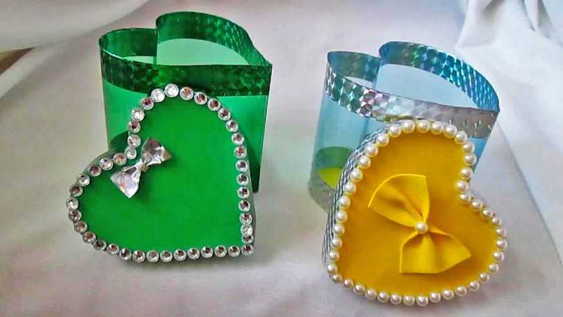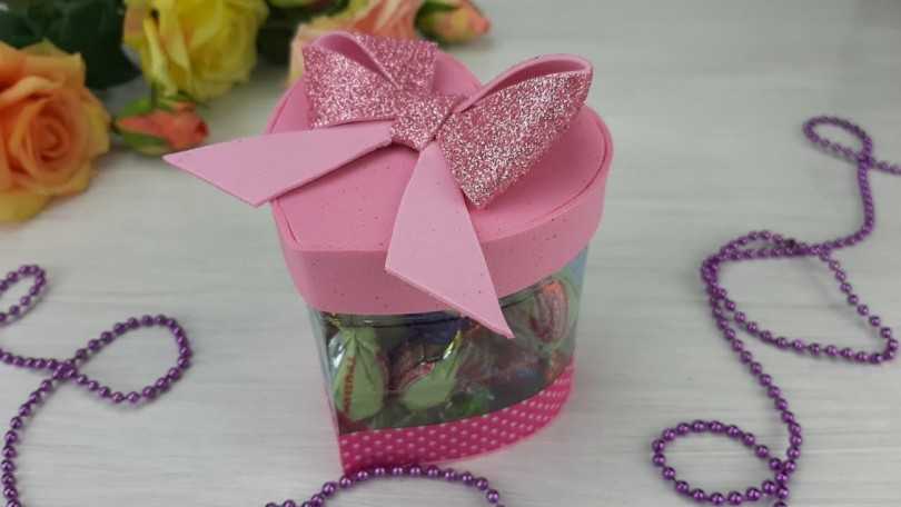 На новый год из пластиковых тар можно сформировать яркие коробочки. Можно сделать футляр для цветов, баночку в виде сердца, ведерко. Поделка своими руками покажет искренние чувства.