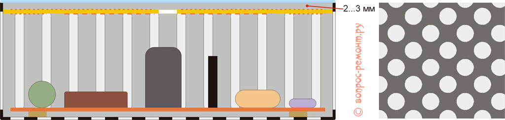 Сталь нужна для магнитного экранирования помимо электрического, а ее малая толщина для предотвращения потерь на вихревые токи. С этой же целью в боковинах корпуса делают частые тонкие вертикальные прорези, а днище выполняют перфорированным в шахматном порядке, см. рис. Идеальный вариант – стенки и днище корпуса из мелкоячеистой стальной сетки. Крышка – любой радиопрозрачный пластик без наполнителя: стекло, акрил, стеклотекстолит, фторопаст, ПЭТ, ПЭ, полипропилен, полистирол. Вариант – бесцветный прозрачный акриловый или нитролак в 4-5 слоев, но не краска или эмаль. Внешнее оформление может быть любым. Именно с таком исполнении беспроводную зарядку для телефона, смартфона, планшета можно держать постоянно включенной на прикроватной тумбочке. Хотя в современном донельзя замусоренном эфире от любых известных источников ЭМП лучше все-таки держаться подальше.
