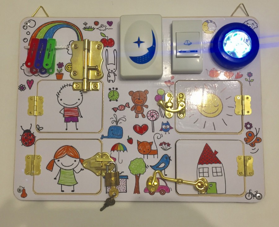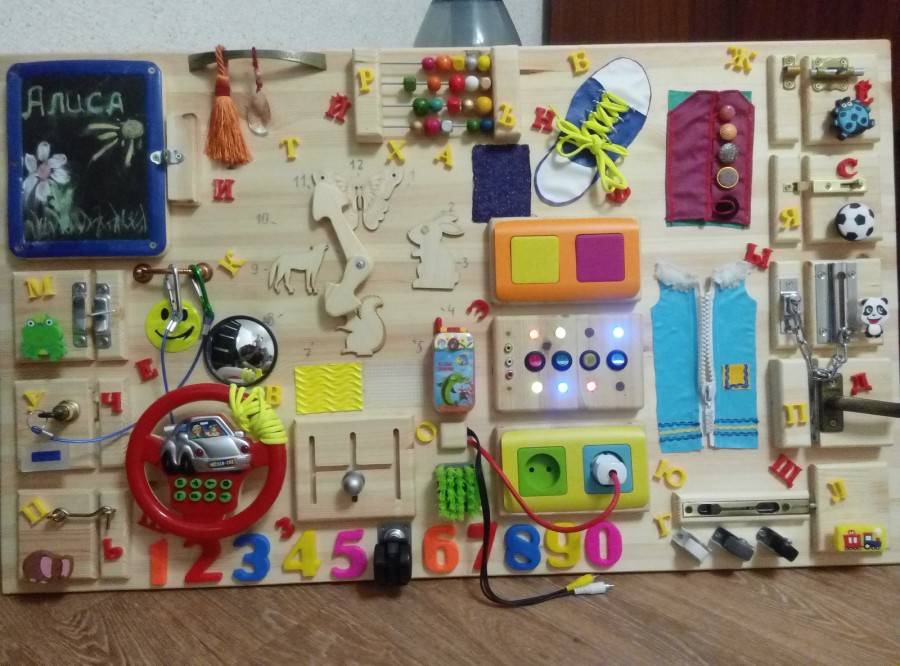 Развивающий бизиборд легко сделать своими руками. При этом на доске можно разместить те предметы быта, детали интерьера и другие элементы, которые интересуют конкретного ребенка. Особой популярностью пользуются именные бизиборды.