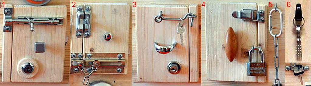 Первая ступень моторно-прикладного блока – дверцы с разнообразными ручками и запорами, поз. 1-4 на рис. Сюда же относится посильный для нажатия детскими ручонками карабин, поз. 5. Наилучший эффект достигается, если дверцы всех 3-х типов – накладные, врезные и накладные над тайниками. Так что не поленитесь, сделайте для бизиборда 2-4 слойную основу. Ключи от замков должны располагаться доступно для ребенка (поз. 6) и быть с большими округлыми головками или на кольце с брелоком, чтобы не подавился, вдруг сунет в рот и рефлекторно сглотнет. Но цеплять ключи на цепочку не надо, таким ключом и взрослому не всегда удобно отпирать замок.