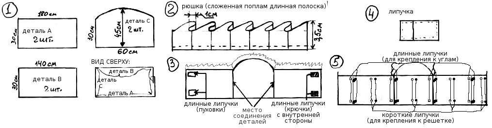 Завязки шьются произвольно; для экономии материалов их изготавливают из остатков ткани. Берется не менее 20 завязок, длина может быть разной, главное, чтобы хватало для комфортного прикрепления к кроватке.