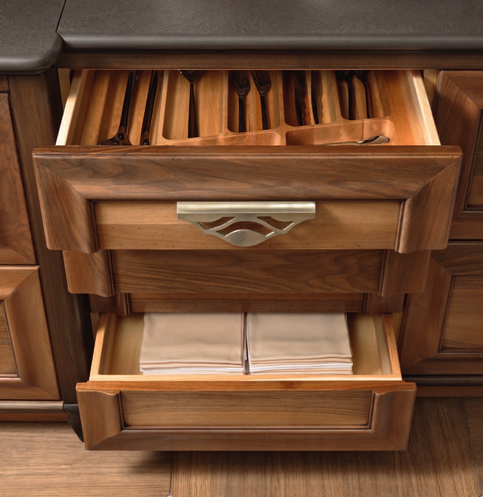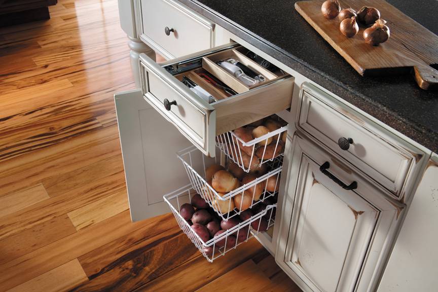 Чтобы было удобно и красиво сконструировать кухню мало, необходимо еще добиться высоких функциональных качеств и эргономики. Сделать это можно с помощью различного вида кухонной фурнитуры, такой как выдвижные ящики, корзины, цокольные ящики и пр.