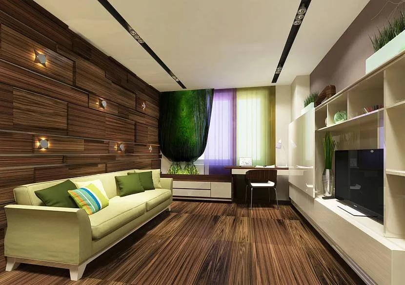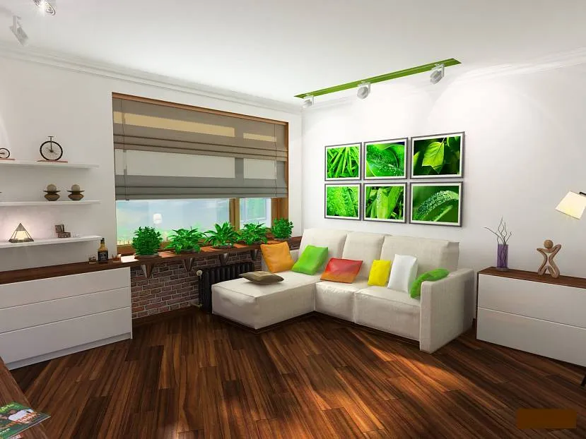 При оформлении гостиной в эко-стиле желательно использовать только натуральные материалы, если такой возможности нет, стоит заменить их имитацией. Обычные «пластиковые» окна совершенно не вписываются в стиль, поэтому рамы лучше сделать деревянными. Бюджетная замена – пластик «под дерево».