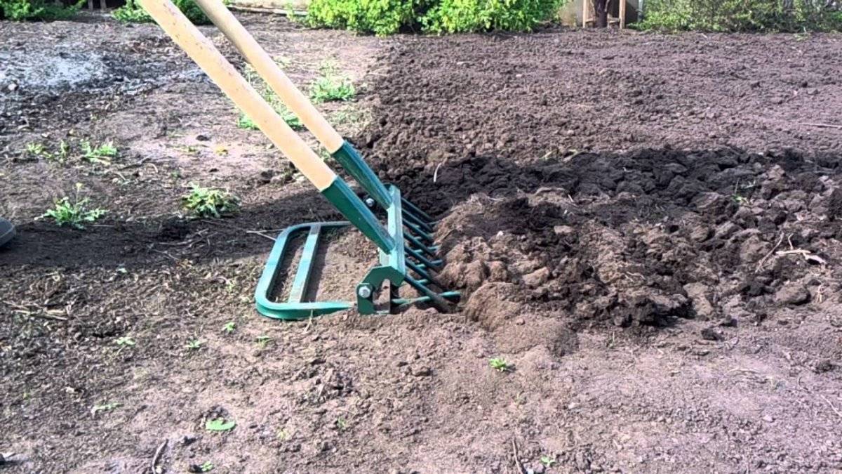 - Зубья вонзаются в землю, и черенок тянется назад. Вилы поднимают пласт грунта, проходящий сквозь вторые вилы и измельчаемый там.