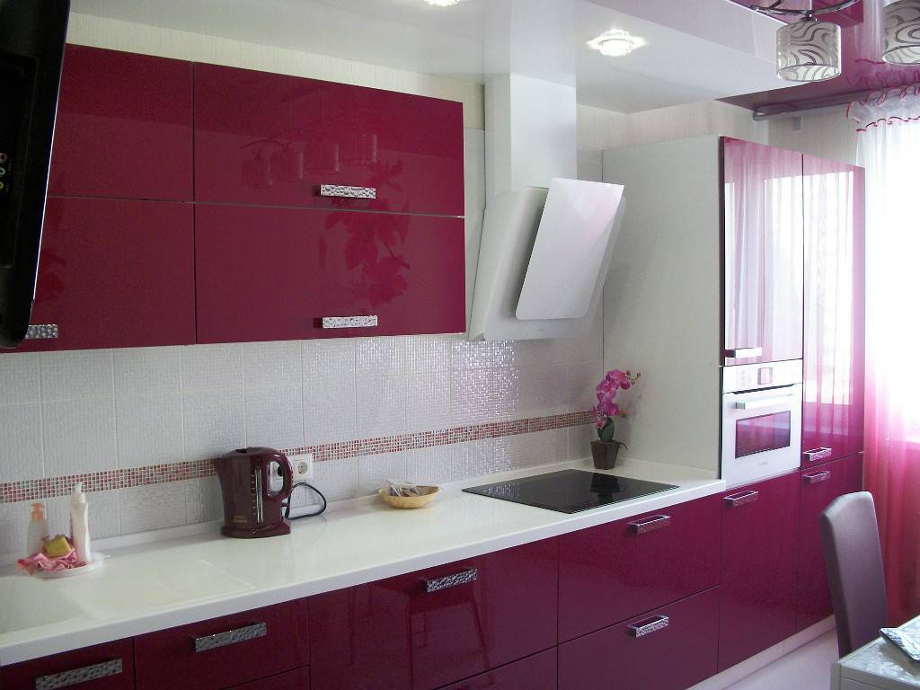 В яркой кухне цвета фуксии очень органично будет смотреться встроенная техника в корпусах из нейтрального оттенка металлик.