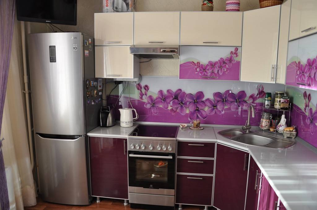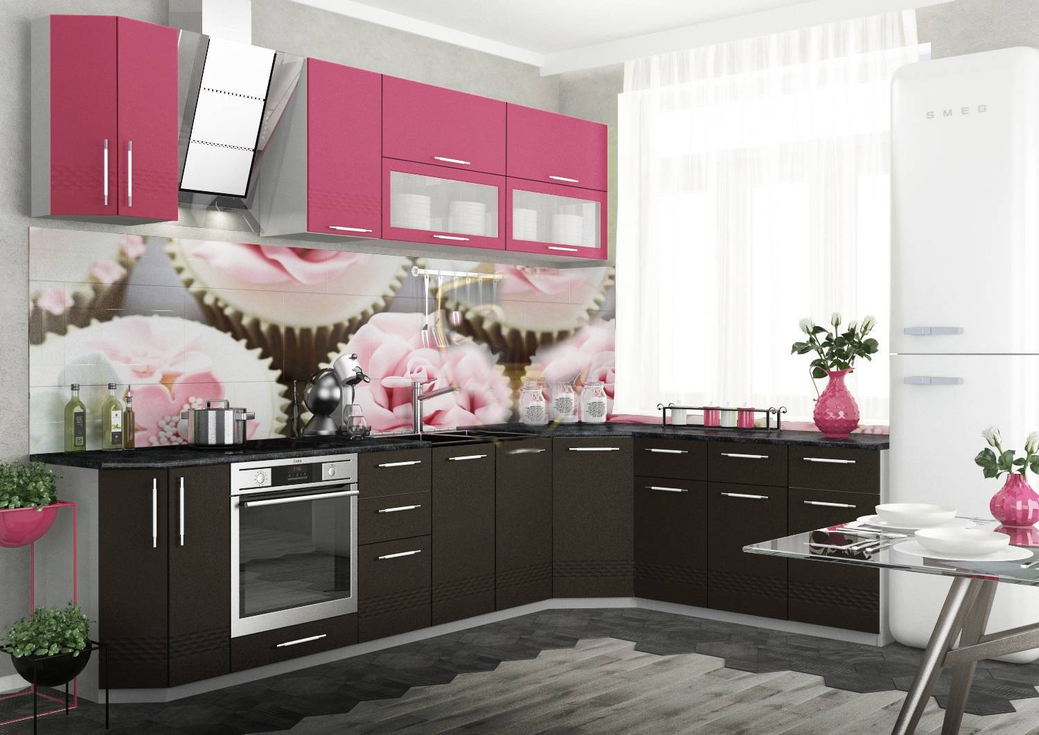 сочетание фартука цвета фуксии с цветом фасада мебели под металлик