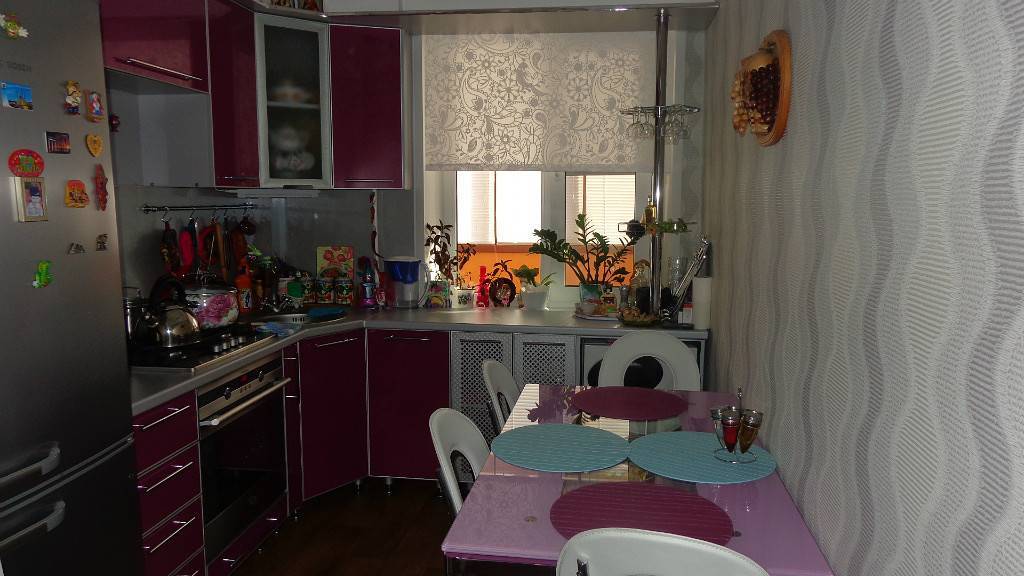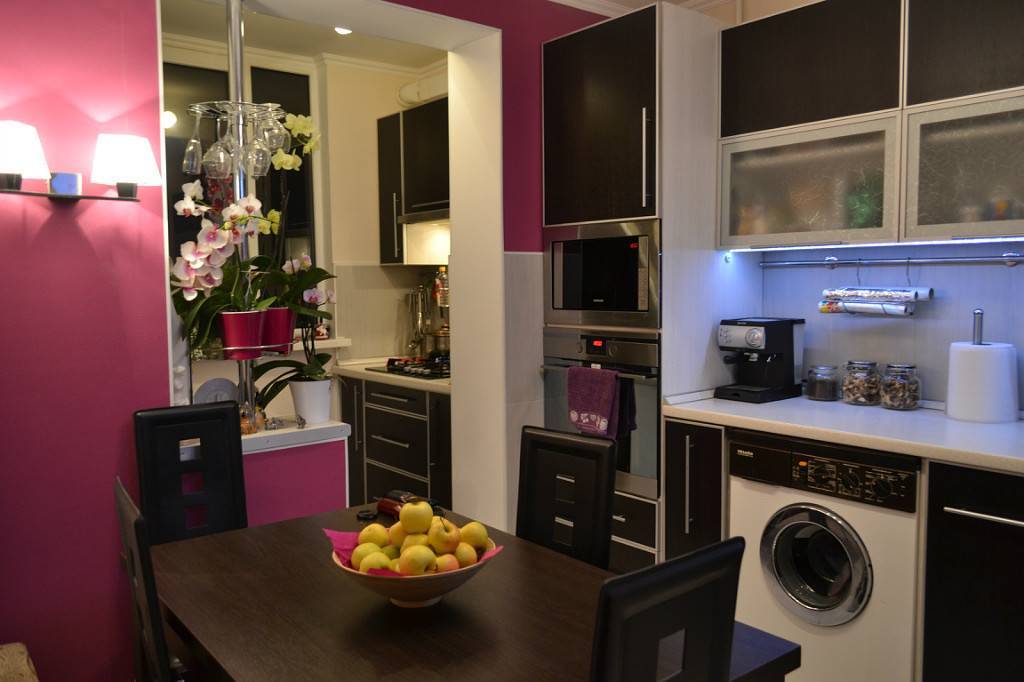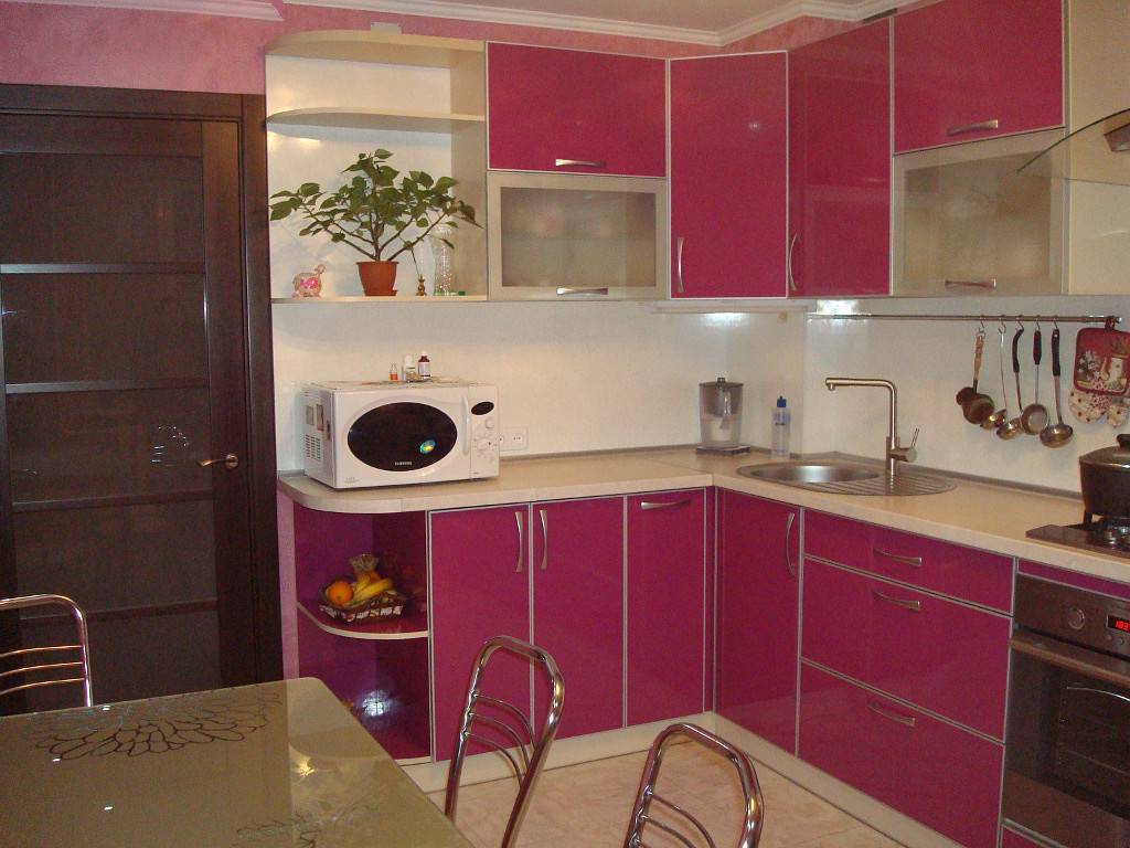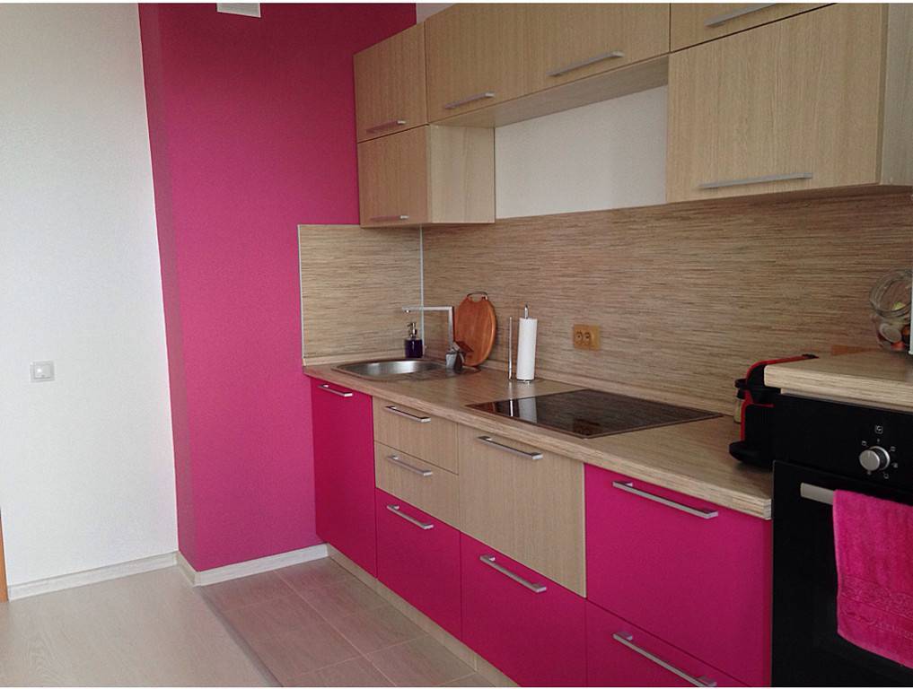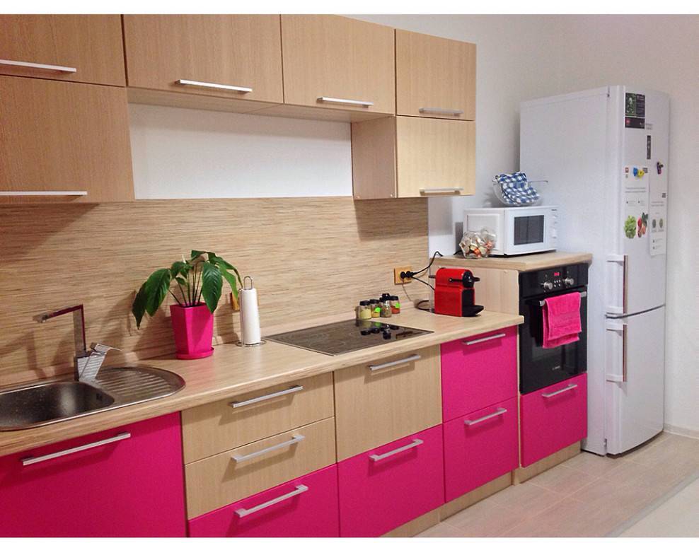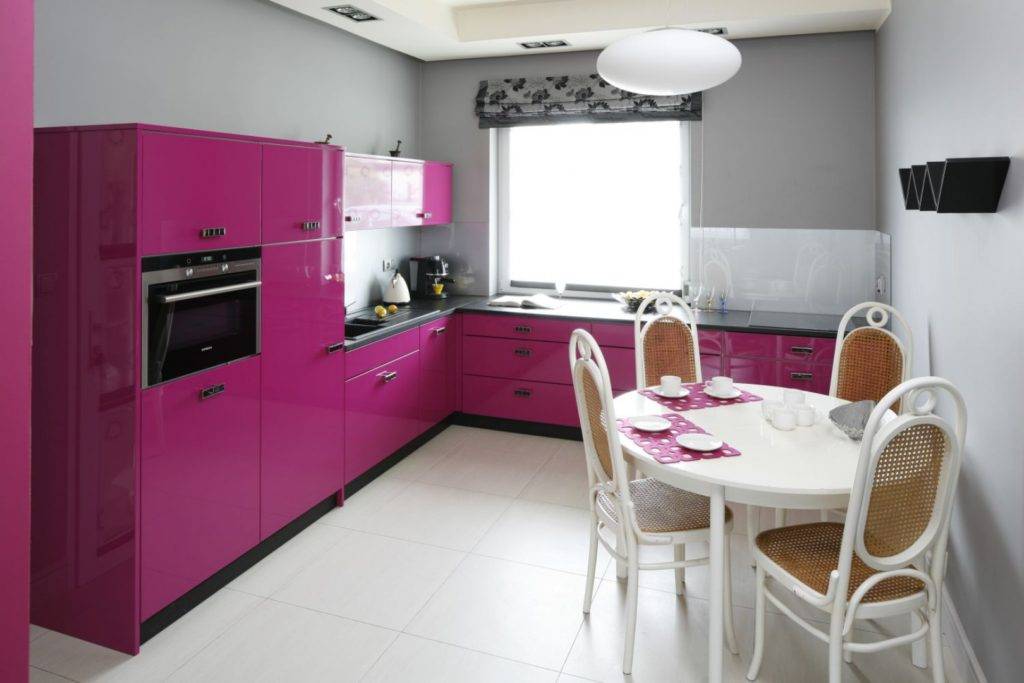 Фуксия на кухне. Кухонные шкафы на кухне создадут энергичную внутреннюю композицию, также подстегнут ваш аппетит. В мини-версии вы можете подумать о посуде и аксессуарах этого цвета (только ручки цвета фуксии добавят характер кухне).