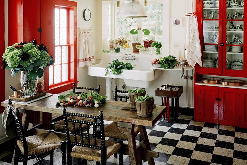 Ярко-красный цвет ассоциируется с кухней в современном стиле. Спокойные оттенки – бордовый, вишневый, терракотовый могут присутствовать в классическом дизайне кухни или в интерьере стиля кантри.