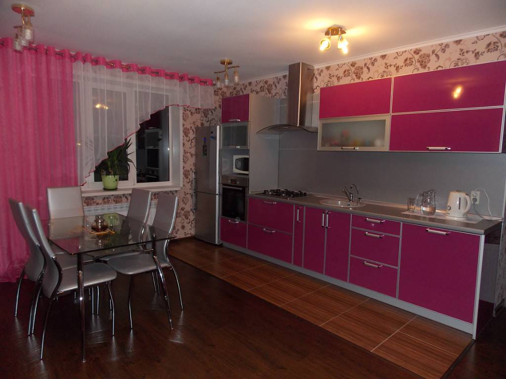 Неплохо смотрятся комнаты, оформленные в коричневом цвете с ярким пурпурным гарнитуром. Если последний сделать матовым, с приглушенными тонами, то интерьер вполне подойдет для кухни в классическом стиле.