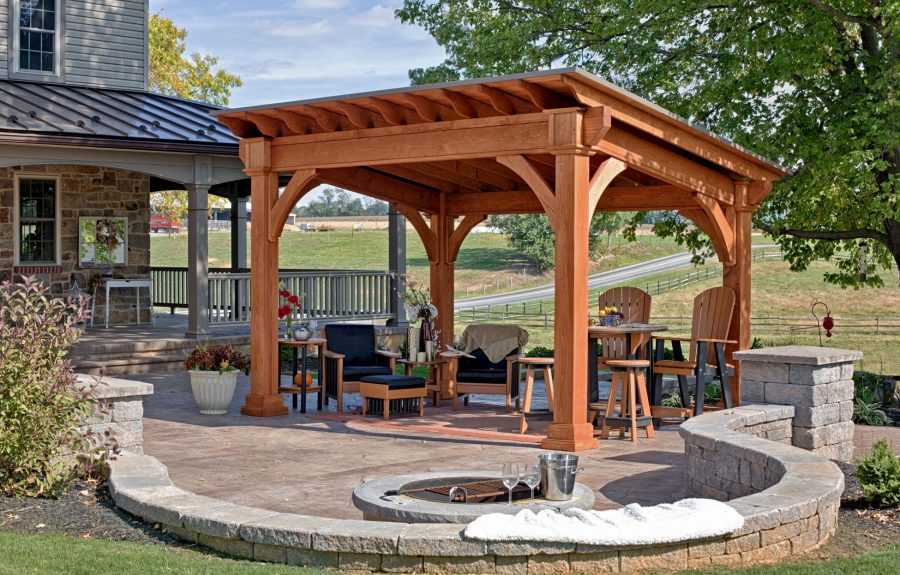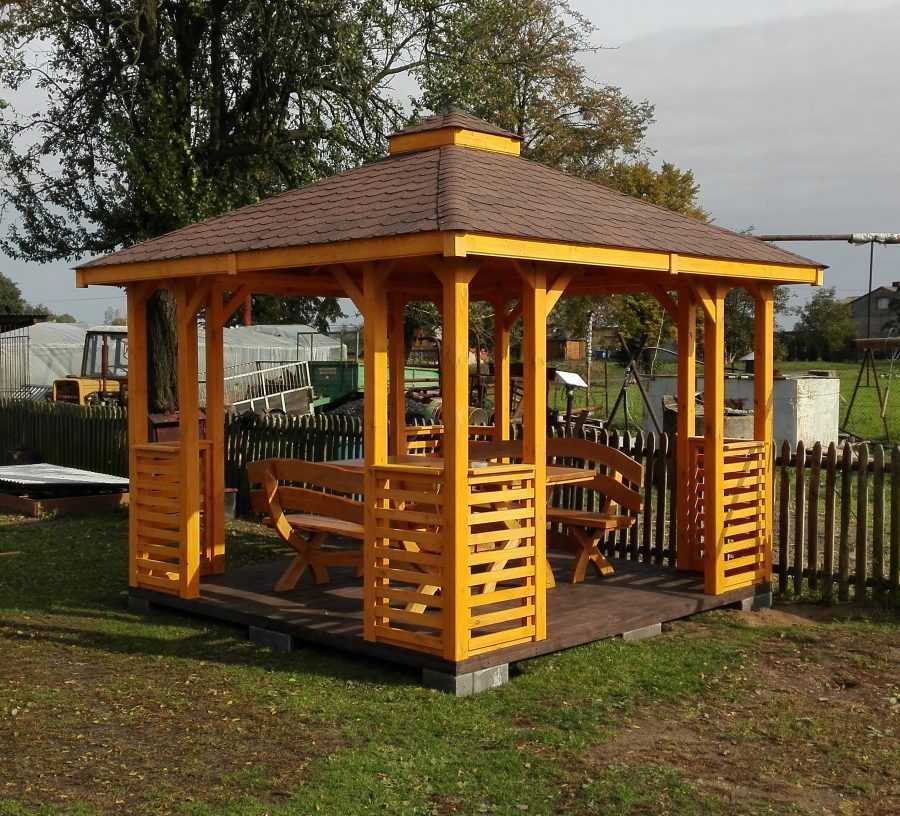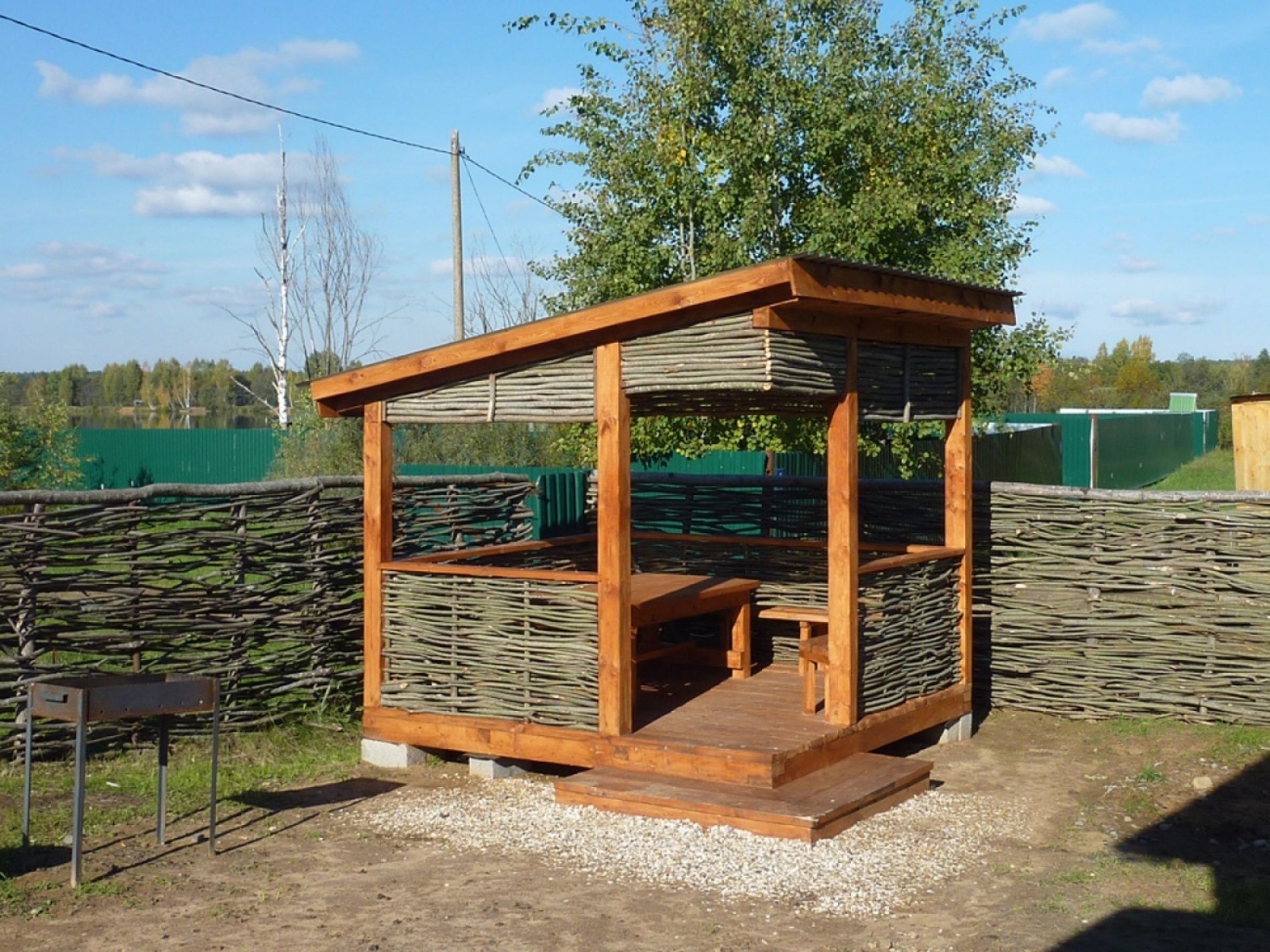 Такой формат беседки является отличной альтернативой полноценной постройке, потому что его строительство оказывается дешевле, а результат практически такой же.