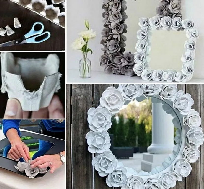 Как вам понравились идеи? И это далеко не все варианты. Вот ещё один вариант в видео-мастер-классе, в котором автор предлагает декорировать зеркало яичными лотками: