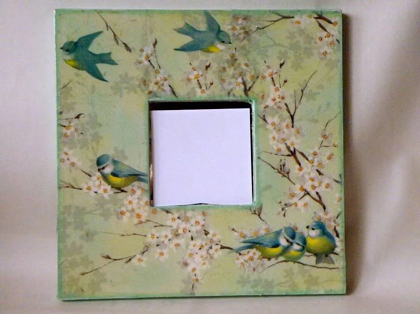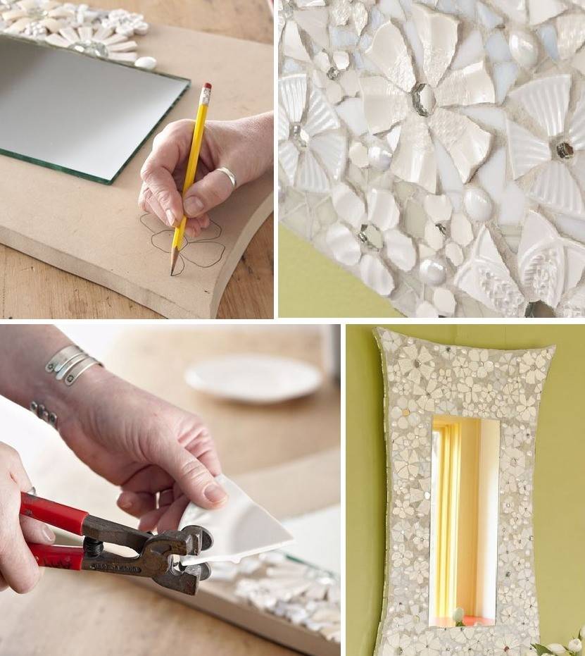 При нежелании выбрасывать разбившуюся любимую вазочку или чашку, их можно применить для украшения зеркала. Осколки посуды нужно нарезать мозаикой, для этого используется профессиональный инструмент. Маленькие составляющие клеятся на заранее подготовленный рисунок обычным клеем, добавляются бусинки, перламутровые камешки и прочие элементы. На последнем этапе поверхность рамки затирается обычной затиркой, после чего протирается тряпкой.