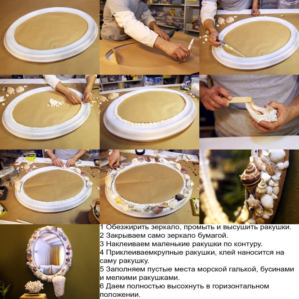 Для работы потребуются акриловые краски, клей и множество ракушек разной формы и размеров. На подготовленную поверхность наносится слой клея, на который укладываются ракушки. Размещение ракушек может быть разнообразным: ровные линии, изгибы, круги, волны и прочее. После высыхания композиция может покрываться слоем акриловой краски или просто лаком для закрепления результата.