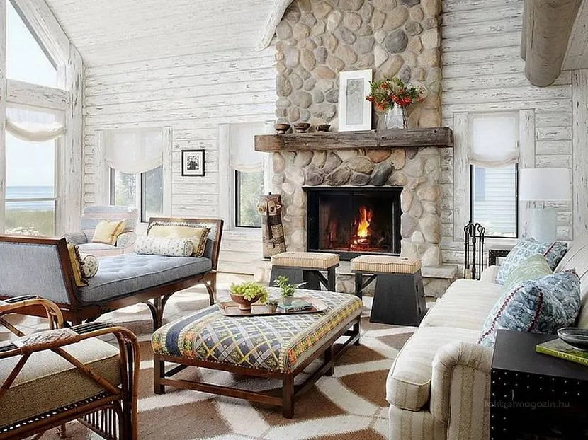 Камень в интерьерах “шале” можно увидеть на стенах и каминах. Обычно это прямоугольные элементы с грубой фактурой, спокойных серых и терракотовых тонов.