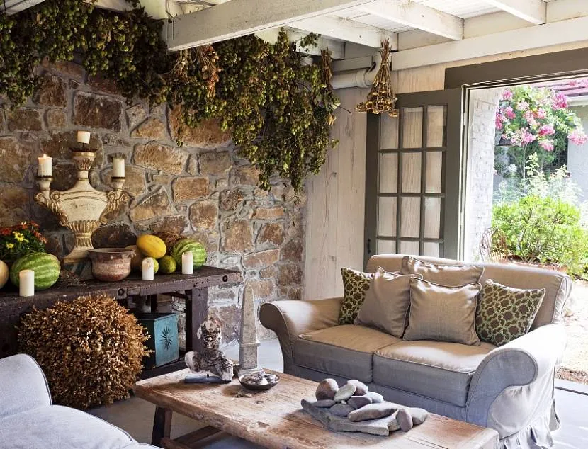 К этим стилям можно отнести прованс, гранж, кантри, шале, шебби-шик. В основном используют текстуры натурального камня в виде пластинчатого сланца, булыжника, песчаника. Каменный декор наряду с натуральным деревом доминирует в интерьере.