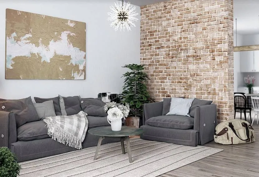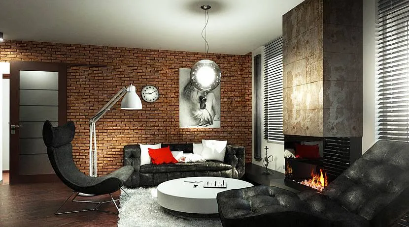 Имитация натурального камня в интерьерах “лофт” не используется. Брутальность и демократичность подчеркиваются кирпичной отделкой. Это может быть кирпичная кладка, окрашенная или покрытая лаком, либо имитация кирпича, а также сочетание кирпичной кладки и декоративной штукатурки, в том числе с барельефами.
