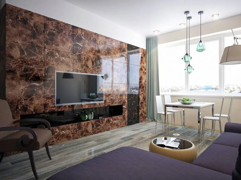 Глянцевая каменная плитка в интерьере гостинойИсточник rumble.com
