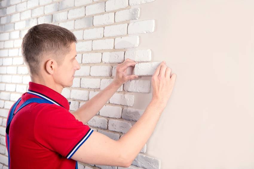 - Плитки декоративного кирпича поочередно прикладываются к стене и крепко прижимаются для лучшего сцепления.