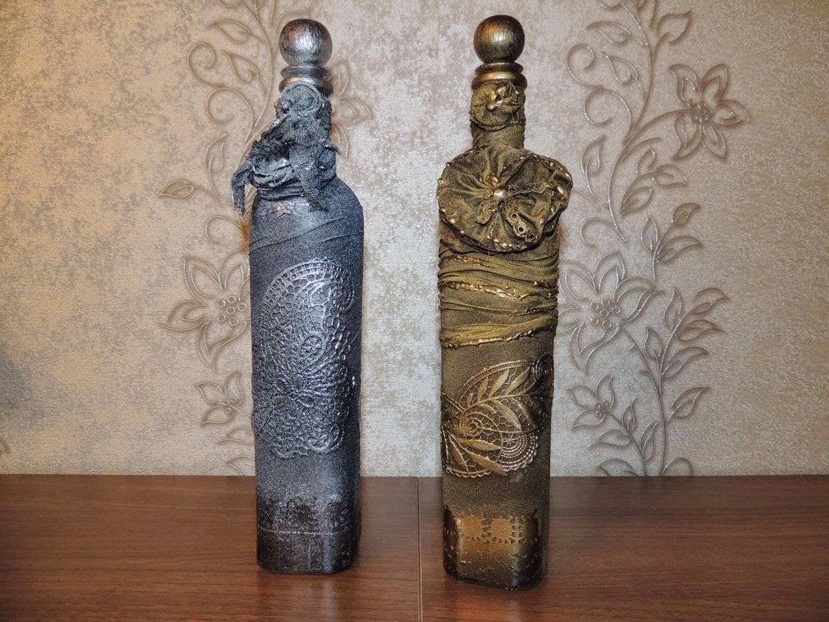 Материал для декора бутылок своими руками в домашних условиях подбирают, исходя из идеи и доступной техники.