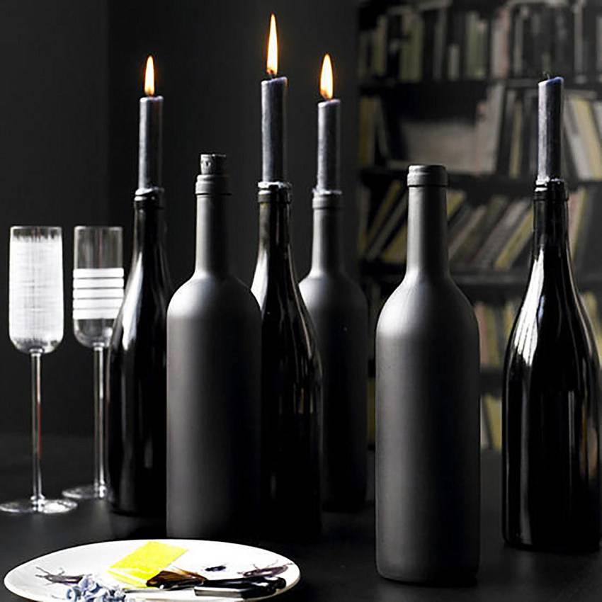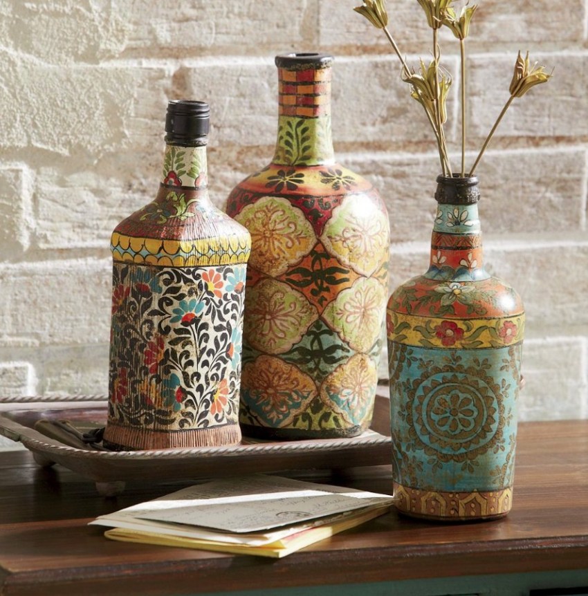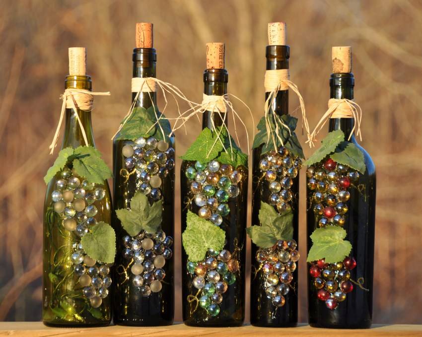 Любая бутылка от вина, раскрашенная акриловыми красками и оклеенная бисером, станет оригинальным акцентом дизайна. Можно пойти дальше и смастерить несложную подделку из шпагата: