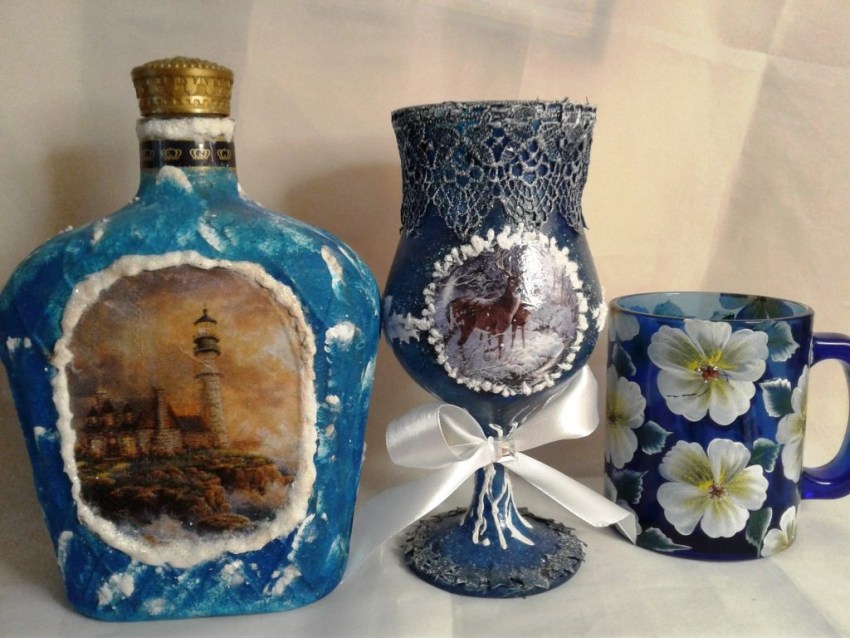 Основой для декупажа служат пустые или полные бутылки, бутылочки, бутыли, а также вазочки, графины, банки из стекла. Пластиковые емкости используются реже, так как клеить на них неудобно, а сами они недостаточно долговечны.
